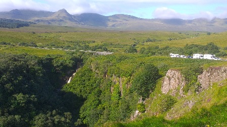 Direkt an der schönen Straße entlang des Trotternish-Gebirges liegen die Lealt Falls. Das Wasser des kleinen Flusses fällt hier über mehrere Stufen bis hinunter zum Meer.