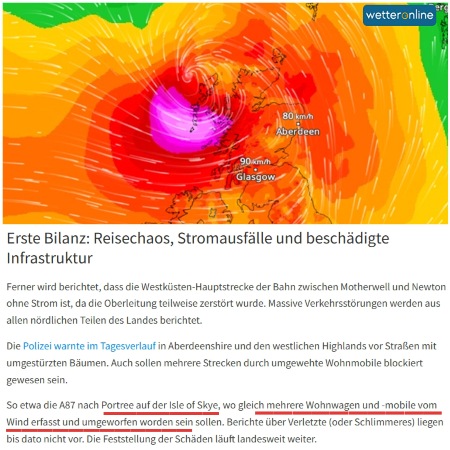 Da auch die geplante Fähre von Armadale (Insel Skye) nach Mallaigvaig (schottisches Festland) wegen der durch den Orkan verursachten Schäden nicht verkehrt, müssen wir mit einem Umweg von ca. 220 km wieder über die Skye-Bridge zurück zum schottischen Festland fahren.