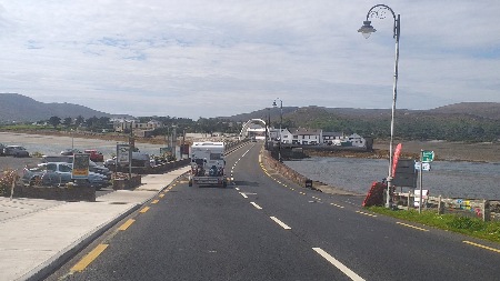 Durch das Nordirland-Protokoll im Zusammenhang mit dem Brexit von Großbritanien (s.o.) ist beim Überqueren der Lifford-Brücke über den Fluß Foyle (1964) nichts von der Grenze zwischen Nordirland und der Republik Irland zu merken.
