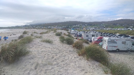 … verbringen dort an der Keel Beach zwischen vielen Tagesgästen und gemeinsam mit anderen Wohnmobilisten einige Tage direkt an einem der schönsten Sandstrände Irlands.