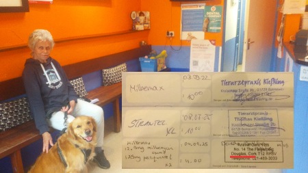 Da Frankreich die Republik Irland nicht als EU-Land betrachtet und die Fähre von Cork (Irland) nach Roscoff (Frankreich) erst am 07.09.25 ankommt, ist die Gültigkeit der Tollwut-Impfung (bis 29.08.25) nicht mehr aktuell. So lassen wir die Tollwutimpfung für unseren Hund Fee beim Tierarzt in Letterkenny auffrischen.