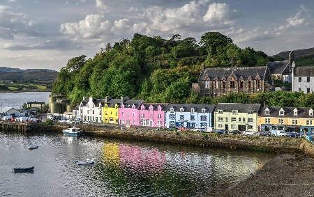Der Hafen der Inselhauptstadt Portree ist geprägt durch die bunten Häuser am Hafen.