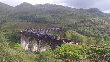 Westlich von Fort William wandern wir zu dem Glenfinnan Viadukt (1898). Der 380m lange Viadukt hat 21 Pfeiler mit einer Höhe von 30 m und ist eine der ersten Beton-Bogenbrücken der Welt; er verbindet auf der Bahnlinie die Ort Fort William und Mallaig. Der Viadukt war mehrfach Kulisse für Harry Potter-Filme.