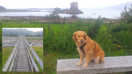Nahe des Ortes Port Appin wandern wir mit Hilfe der sog. Jubiläumsbrücke (1898) über die Gezeitensümpfe des Loch Laich zum 15 m hohen Turmhaus Castle Stalker (1320).