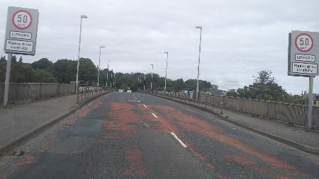Durch das Nordirland-Protokoll im Zusammenhang mit dem Brexit von Großbritanien (s.o.) ist beim Überqueren der Lifford-Brücke über den Fluß Foyle (1964) nichts von der Grenze zwischen Nordirland und der Republik Irland zu merken.