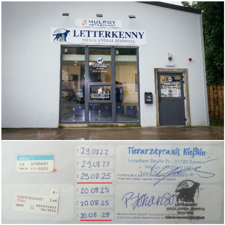 Da Frankreich die Republik Irland nicht als EU-Land betrachtet und die Fähre von Cork (Irland) nach Roscoff (Frankreich) erst am 07.09.25 ankommt, ist die Gültigkeit der Tollwut-Impfung (bis 29.08.25) nicht mehr aktuell. So lassen wir die Tollwutimpfung für unseren Hund Fee beim Tierarzt in Letterkenny auffrischen.