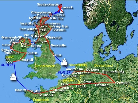 Ursprünglich sollte die Reise in der Zeit von Anfang April bis Mitte Juni erfolgen, aber durch den schweren Haushaltsunfall von Kerstin musste der Start um 3 Monate verschoben werden.Durch diese zeitliche Verschiebung in die Hochsaison waren auch alle Fähren zu den Shetland-Inseln bereits ausgebucht, so dass wir leider auf diesen Teil der Reise verzichten mussten.