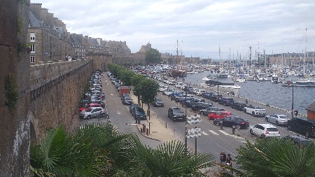 Die hohe Stadtmauer (12. Jh.) von Saint Malo umgibt auf einer Länge von ca. 2 km die wieder aufgebaute historische Altstadt (1944 durch anglo-amerikanische Bomber zu 85% zerstört).