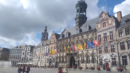 Der Grand Place in Mons in Belgien ist das historische und kulturelle Zentrum der Stadt und bekannt für seine beeindruckende Architektur, wie das Rathaus (1477) mit seinem Glockenturm.